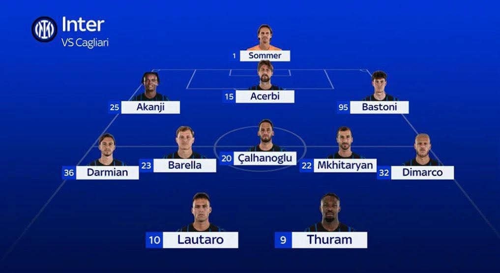 Inter a Cagliari con Sommer tra i pali, Bastoni torna in difesa. Darmian favorito su Dumfries, in attacco di nuovo la coppia Lautaro-Thuram.
