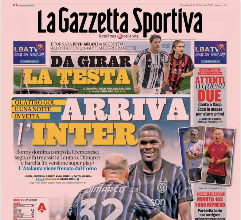 La GdS: “Bonny domina contro la Cremonese, gol e tre assist. Dimarco e Barella super. L’Atalanta si ferma col Como.”